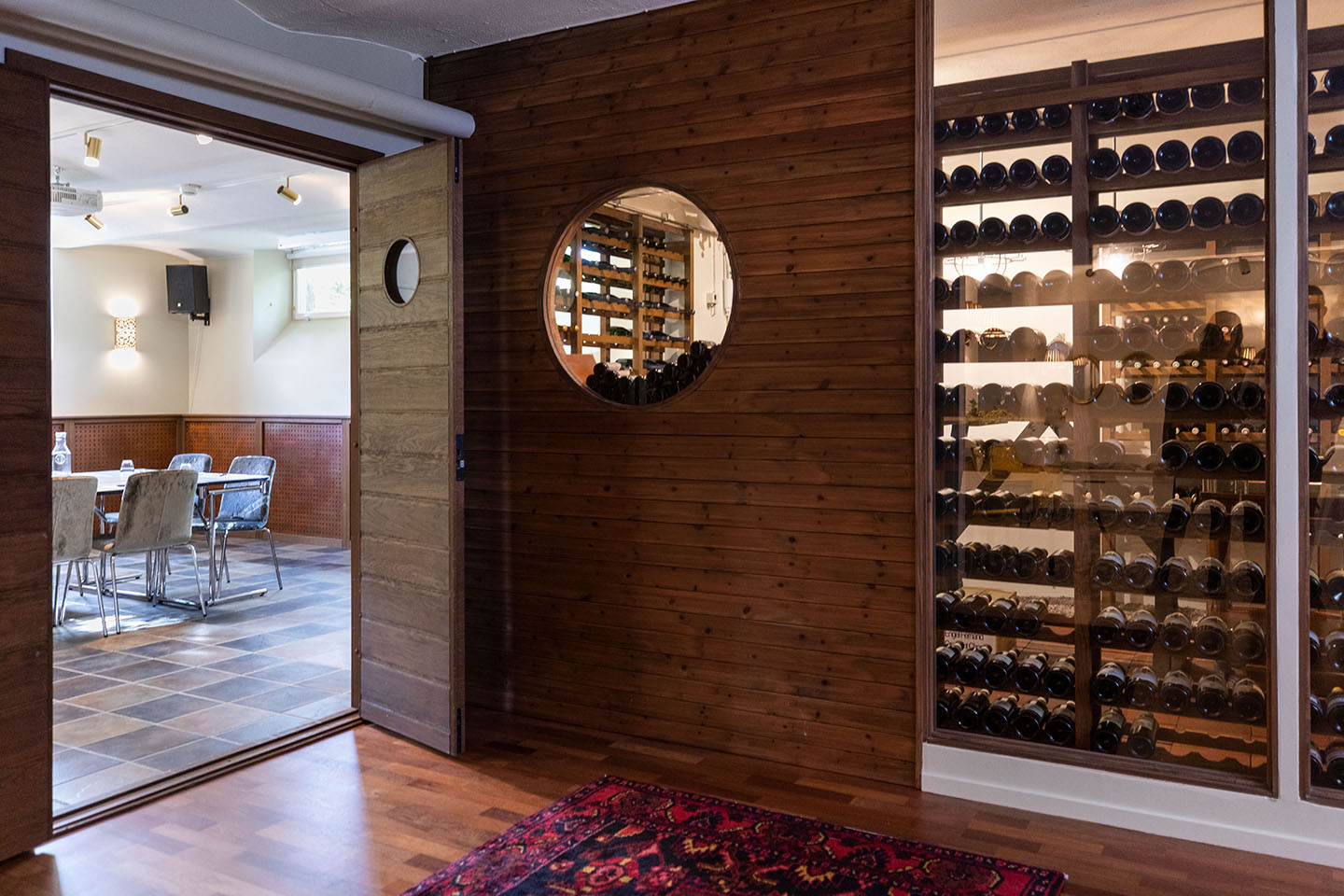 Källarvåningen rymmer även ett mindre foajérum och ett rum med en bar och en vinkällare. Intill baren finns dessutom ett kök, vilket gör det här till en utmärkt lokal för till exempel matlagningsaktiviteter och dryckesprovningar.