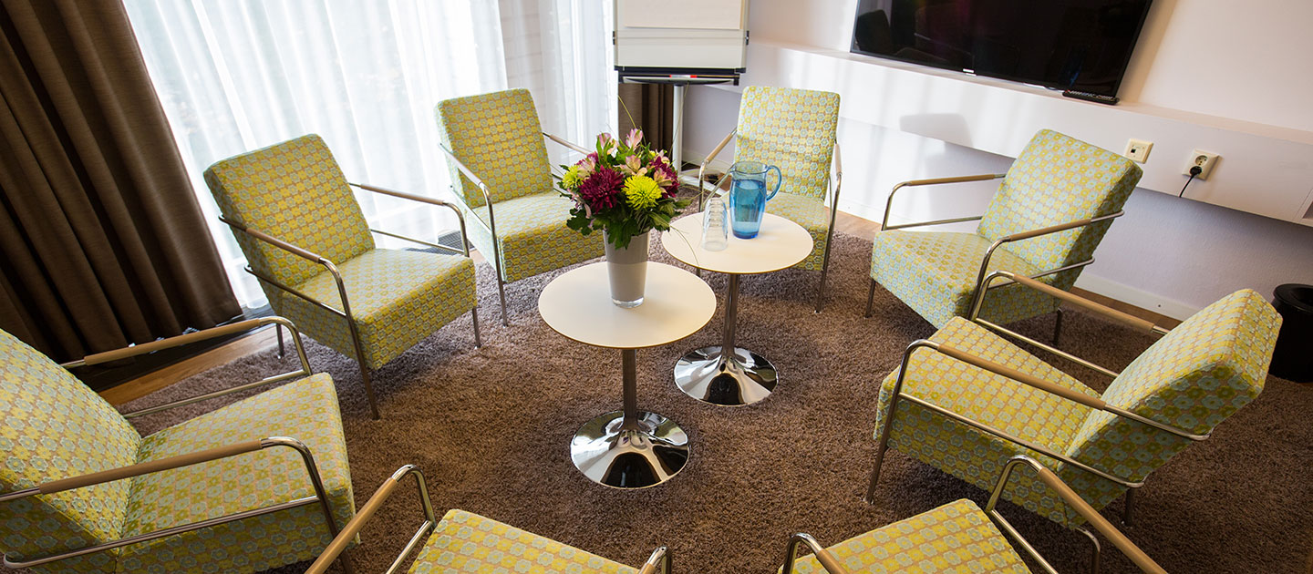 Möteslokalen Noraberget är möblerad med fåtöljer och småbord perfekt för exempelvis ett planeringsmöte, utvecklingssamtal eller ett kreativt möte.