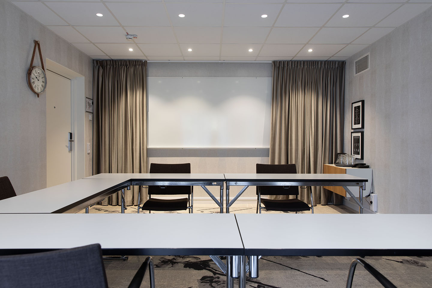 Möteslokalen Sjöberg ligger höst uppe vid baren och övre foajén. Sjöberg går att möblera för 12 personer i U-bord eller styrelsesittning.